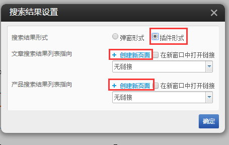 ④.点击下图中的创建新页面,系统将自动创建一个带有文章搜索结果插件或者产品搜索结果插件的页面。